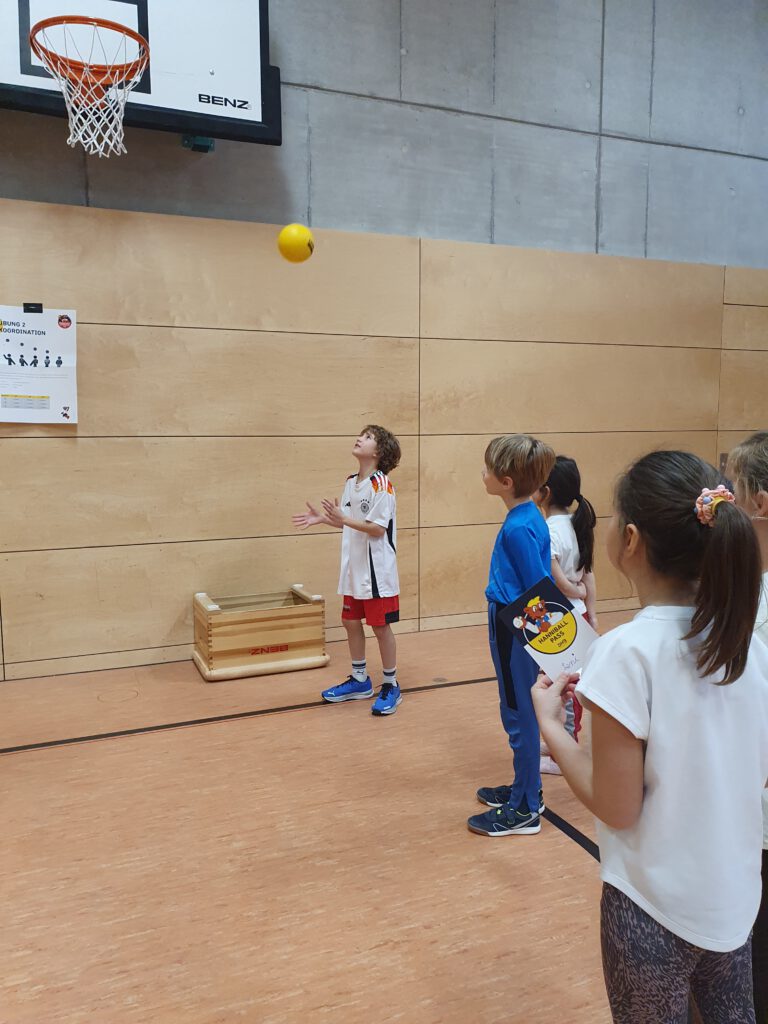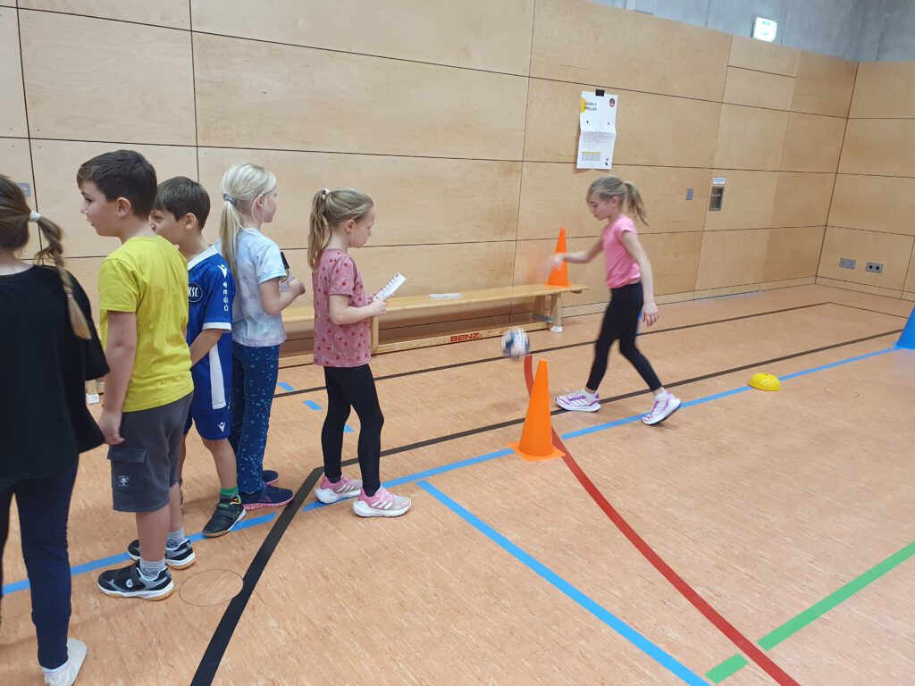 Wie so üblich vor einer Sportstunde, mussten zunächst einmal die Muskeln aufgewärmt werden. Dies klappte am besten mit den Lauf- und Fangspielen „Feuer, Wasser, Sturm“ und „Kettenfangen“. Nachdem alle aufgewärmt waren, ging es endlich richtig los. An insgesamt fünf verschiedenen Stationen wurden unterschiedliche Übungen erprobt, die alle für das Handballspiel wichtig sind: Werfen und Fangen, Zielwerfen, Koordination, Prellen und Schnelligkeit. An jeder Station konnten die Kinder Punkte sammeln und erhielten am Ende ihre Laufkarte mit der Rückmeldung ihrer persönlichen Ergebnisse mit nach Hause. Ein herzliches Dankeschön an die Übungsleiter und Übungsleiterinnen, die uns diese sportliche Erfahrung ermöglicht haben. Vielleicht hat der Tag beim ein oder anderen Zweitklässer den Wunsch geweckt, demnächst mit Handballtraining zu beginnen.