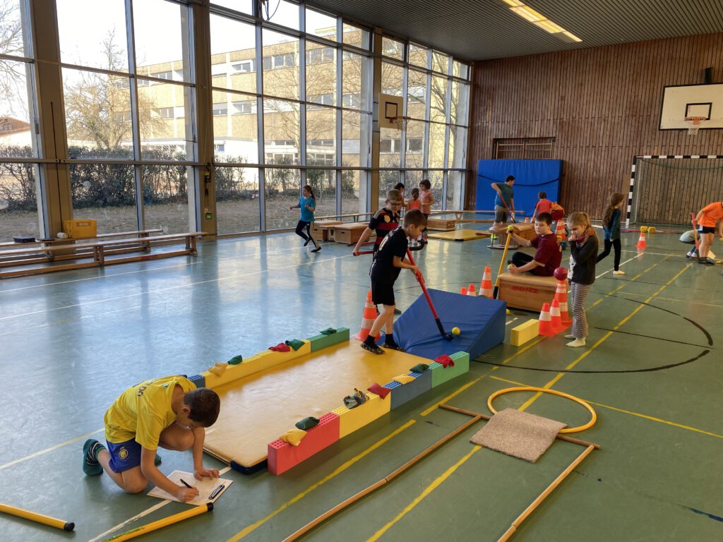 In der letzten Sportstunde erlebte die Klasse 3b der Südschule Neureut den Sportunterricht einmal ganz anders: Die Sporthalle verwandelte sich in eine kreative Minigolf-Anlage. Gemeinsam bauten die Kinder in Gruppen mit großer Begeisterung insgesamt sieben abwechslungsreiche Minigolf-Bahnen auf.