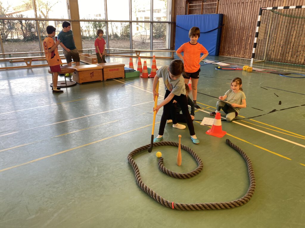 Nach dem Aufbau erhielt jede Gruppe einen Laufzettel und einen Stift, um die benötigten Schläge zu notieren. Gespielt wurde mit Hockeyschlägern und Tennisbällen. Mit großer Konzentration und viel Ehrgeiz versuchten alle, den Ball ins Ziel zu bringen. Jeder gab sein Bestes und jeder Treffer sorgte für strahlende Gesichter. Dieser besondere Sportunterricht bereitete allen Beteiligten viel Freude und zeigte, wie viel Spaß Bewegung und Kreativität im Team machen können.