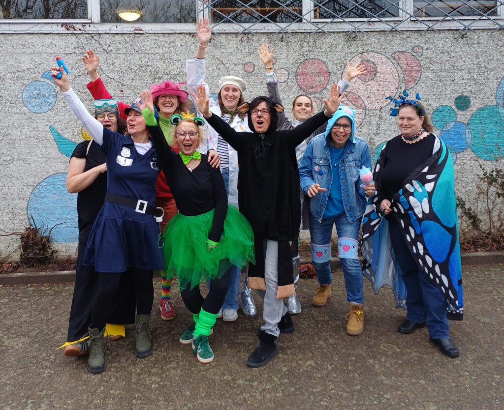An „Altweiberfasching“ feierte die Südschule eine bunte und fröhliche Faschingsfeier. Die Aula und die Klassenzimmer waren zum Teil festlich geschmückt, und die jungen Närrinnen und Narren präsentierten eine Vielzahl toller Kostüme: von kreativen Verkleidungen über lustige Maskenkreationen bis hin zu märchenhaften Outfits. Die Kinder hatten sichtlich Spaß daran, sich zu verwandeln.
